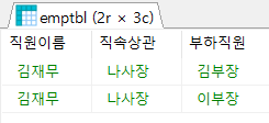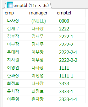 emptbl 이라는 조직도 테이블이 존재한다. 여기서 emp는 직원이름이고 manager는 직속상관 emptel은 구내번호이다.