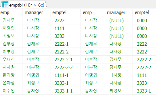 테이블을 보면 '김재무'라는 데이터가 존재하는 동시에 김재무는 김부장,이부장의 직속상관열에 들어가있다.